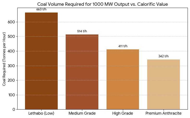 In this chart reflecting the Coal Volume Required for 100 MW Output, vs Calorific Value, and the Escom Lethabo Low-Grade Coal, is depicted on the far-left, requiring 663 tons per hour, to produce 1000 MW output, and if Eskom used High Grade RB1, and RB2, that would require only 411 tons per hour.