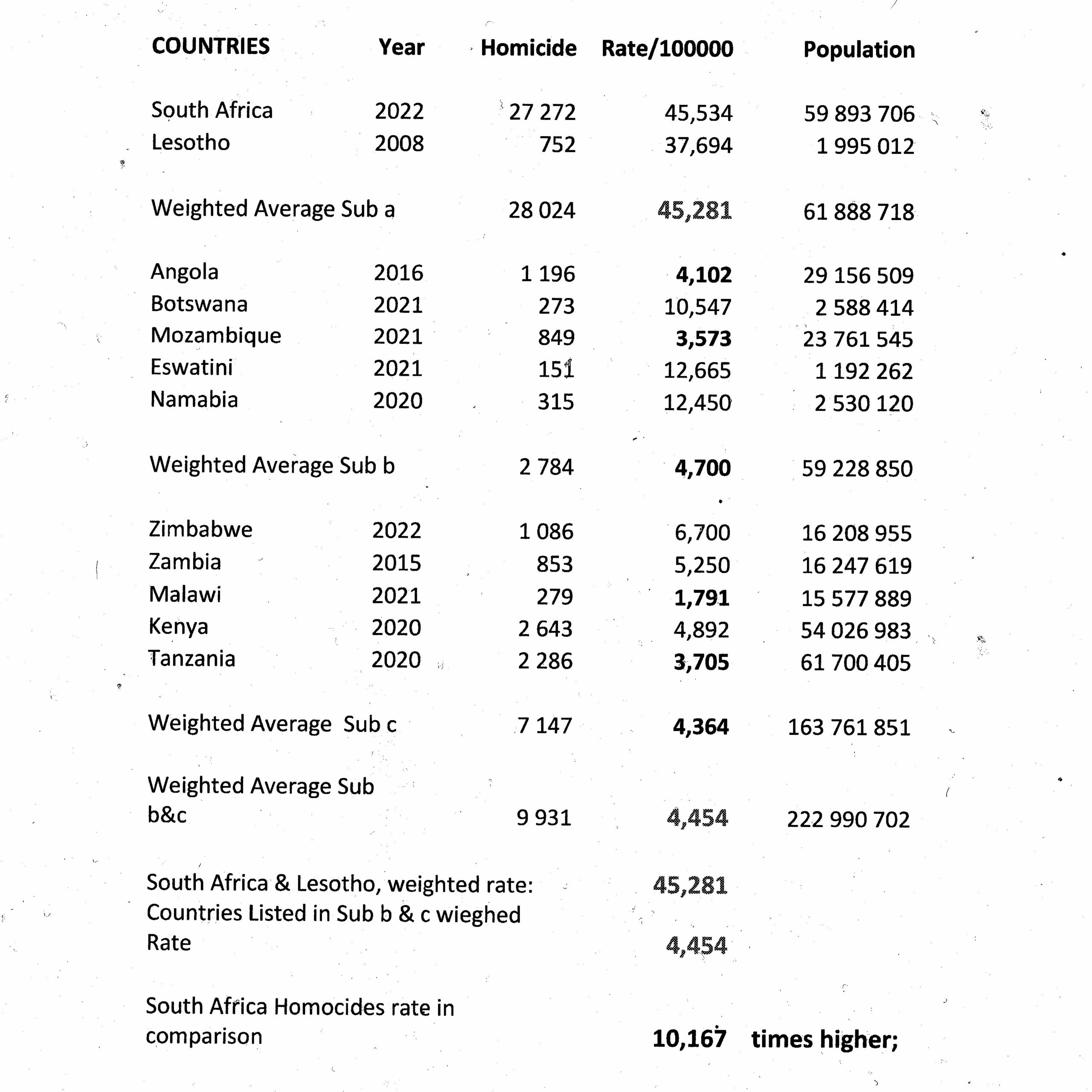 I have not compared with the total Sub-Saharan Africa, in the table below, I have included Lesotho with South Africa, in sub “a”, as their homicide rate is almost as high as South Africa, their population far smaller, but their population, surrounded by South Africa, a large portion of the population employed on the South African gold mines, and employed in other sectors of the South African Economy. The Lesotho population, would have suffered similar disturbances, and very much part of South Africa social interaction.